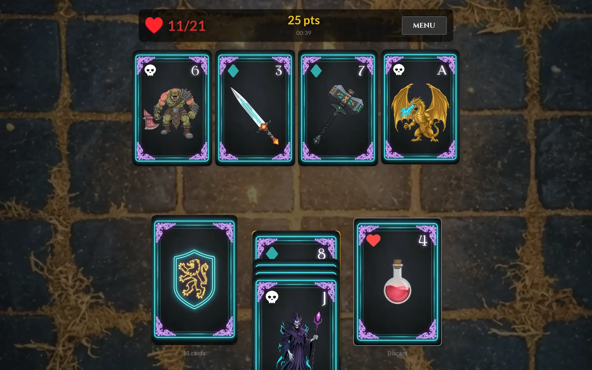 At its heart, Soltura is a supercharged version of the classic solitaire roguelike, Scoundrel. Players are presented with a dungeon of 1rooms filled with monsters represented by playing cards. Your goal is simple: use your weapons (the diamonds) to defeat monsters (clubs and spades), heal with hearts, and not just survive, but conquer.